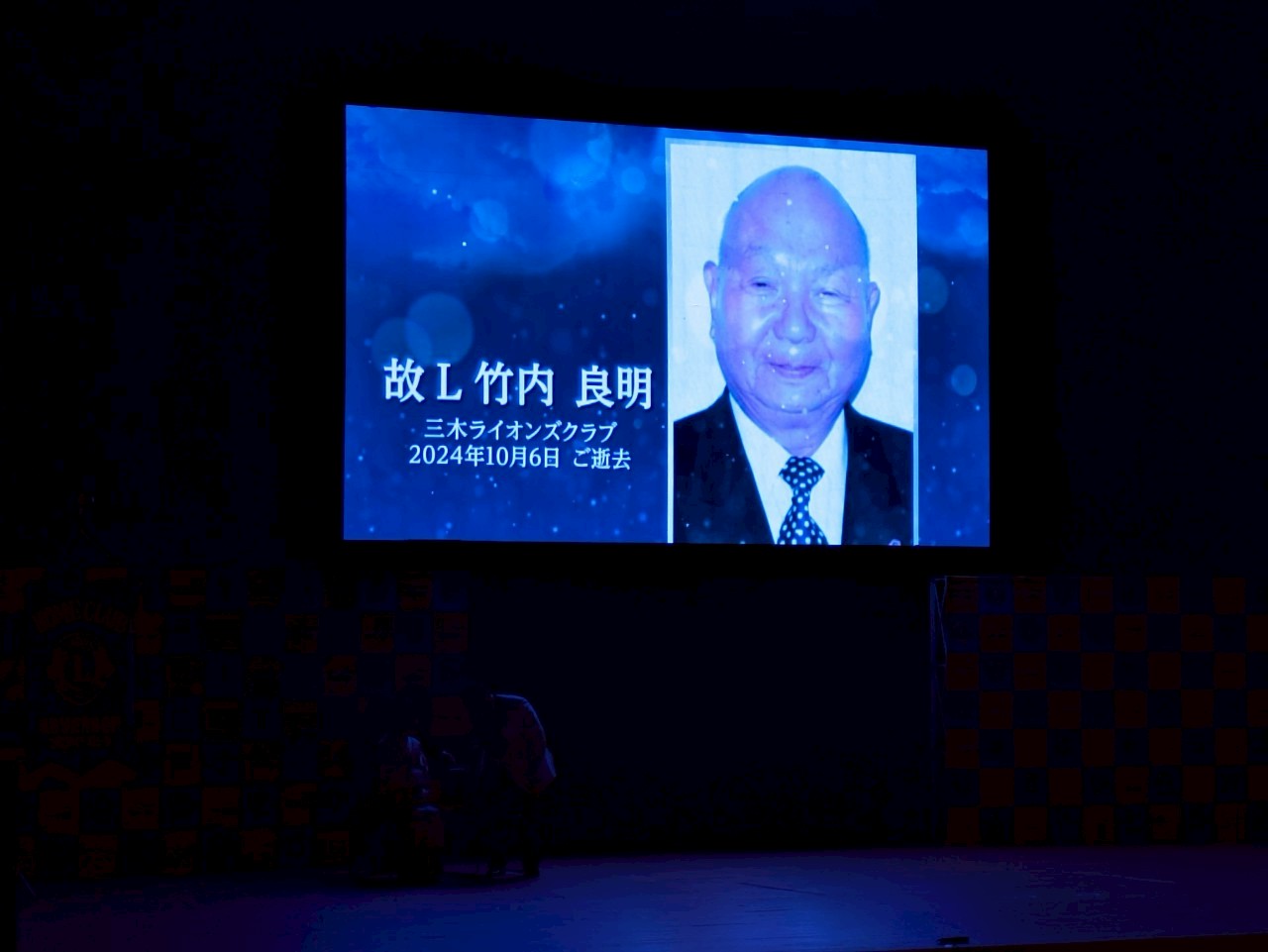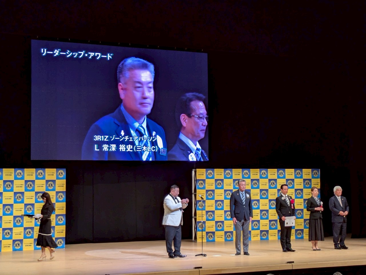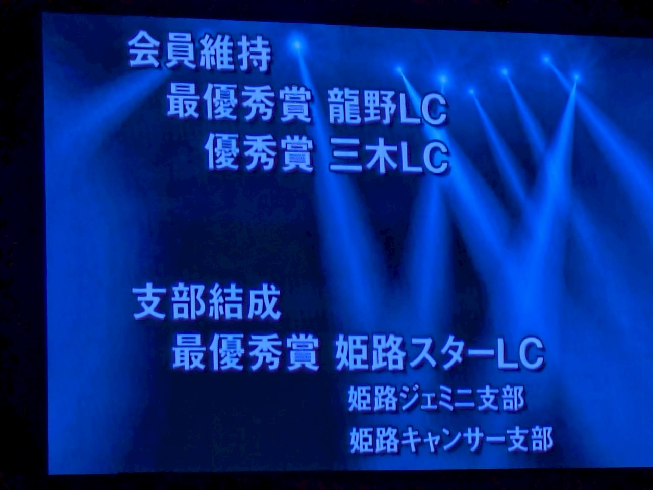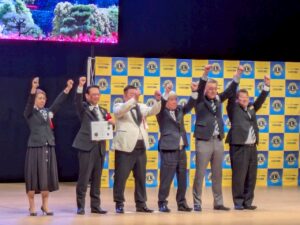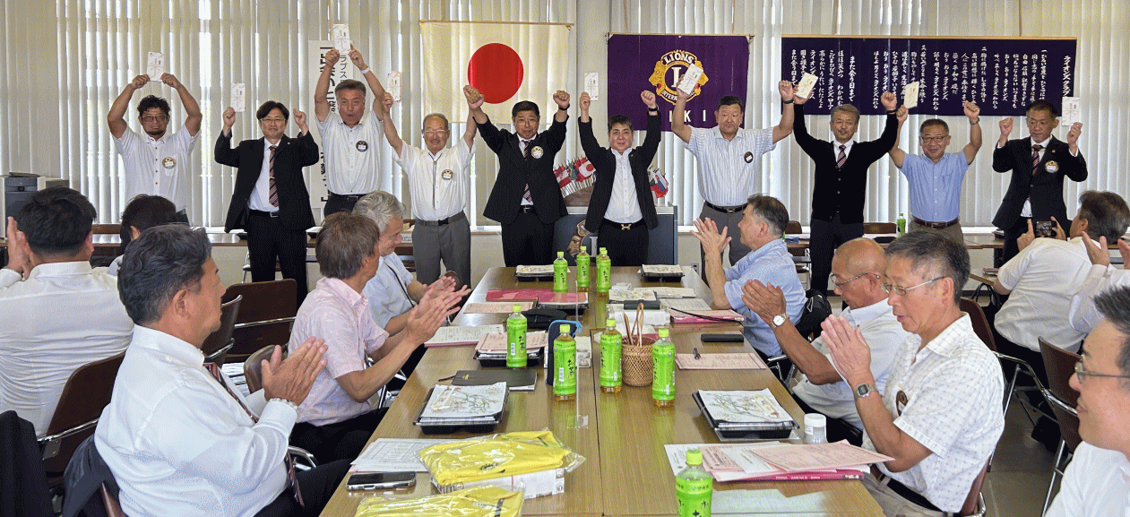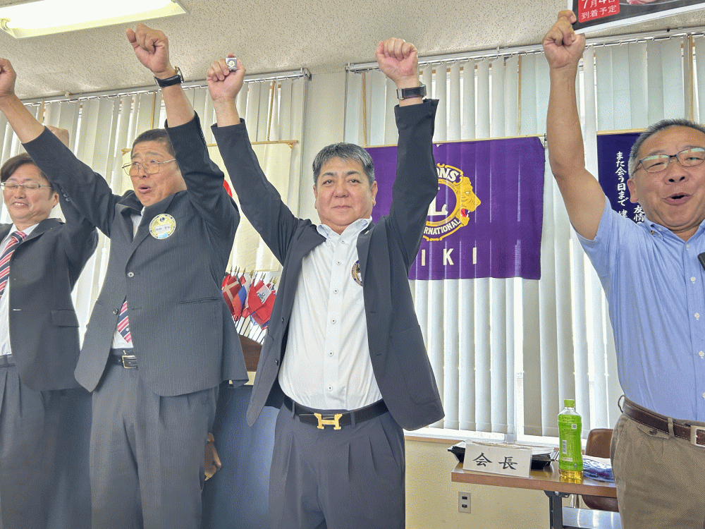 左からL常深 裕史 次にプレゼントを贈呈する会長L西畑 智裕、3番目に